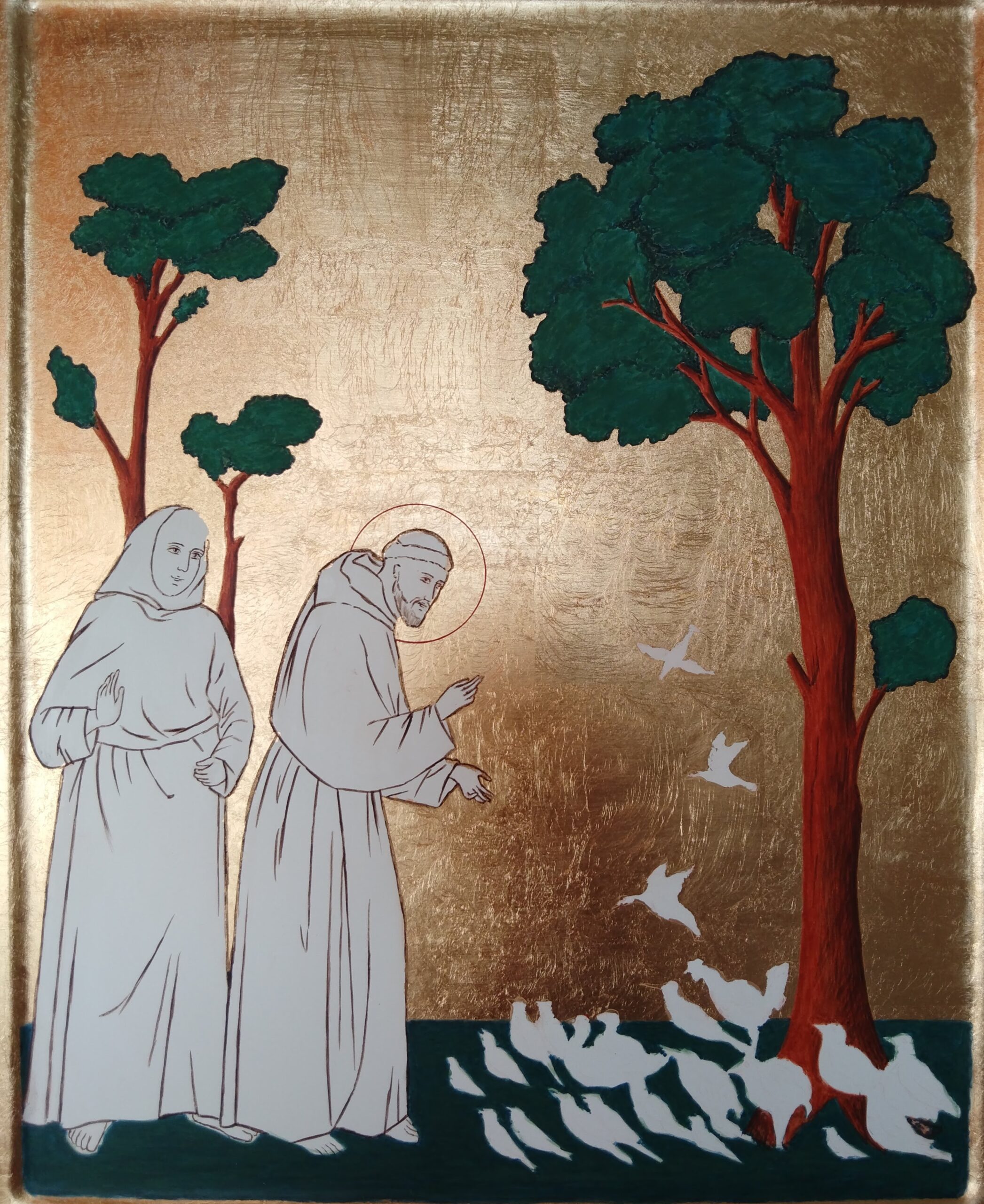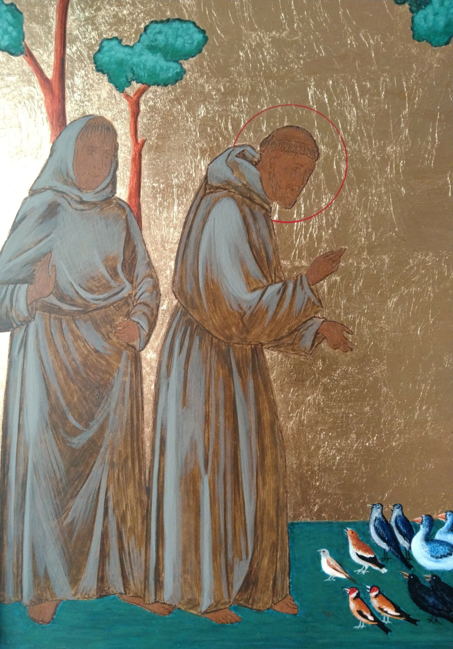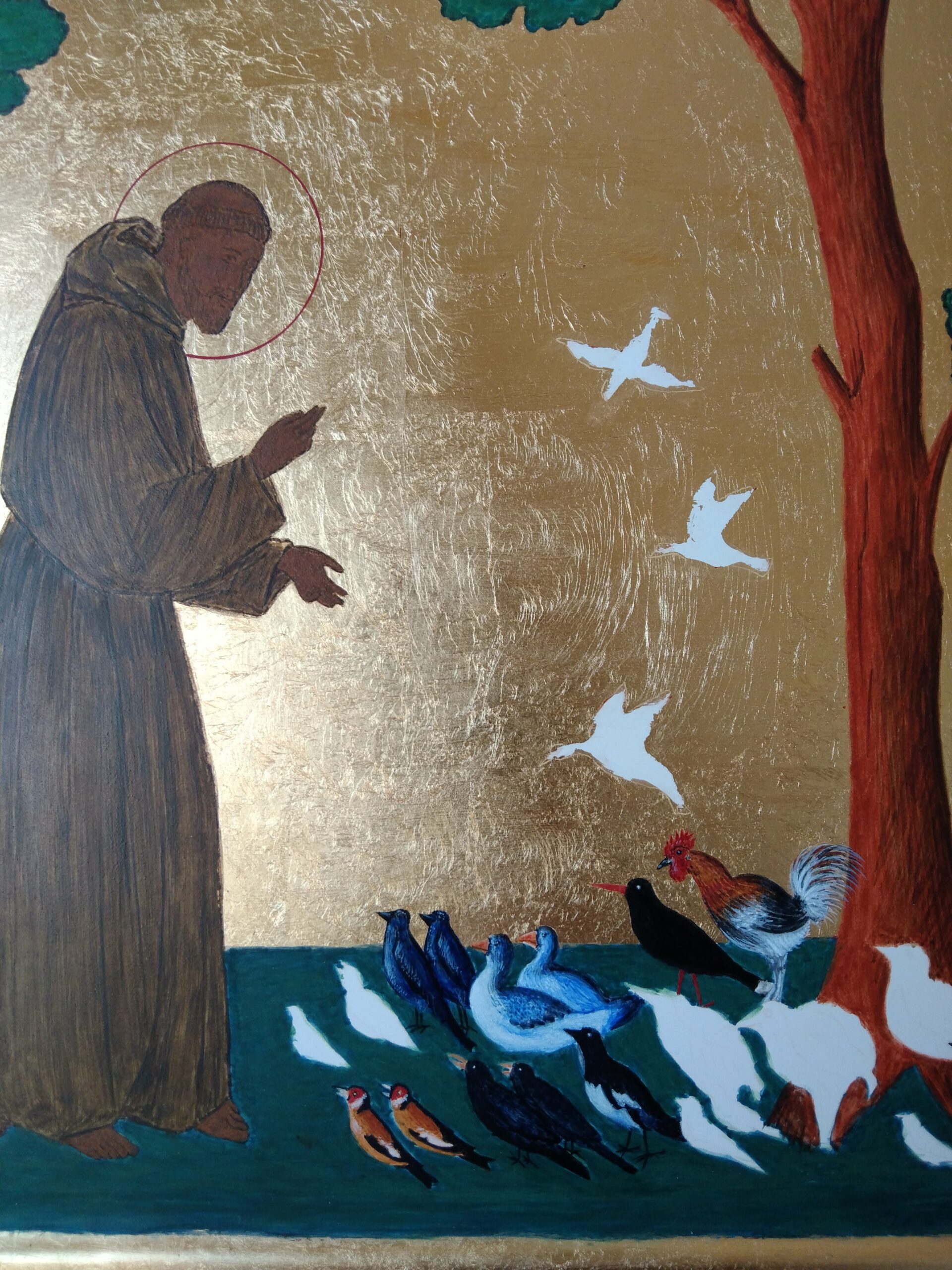 La commande reçue était « St François prêchant aux oiseaux » dans le style du peintre italien Giotto du XIVème siècle.