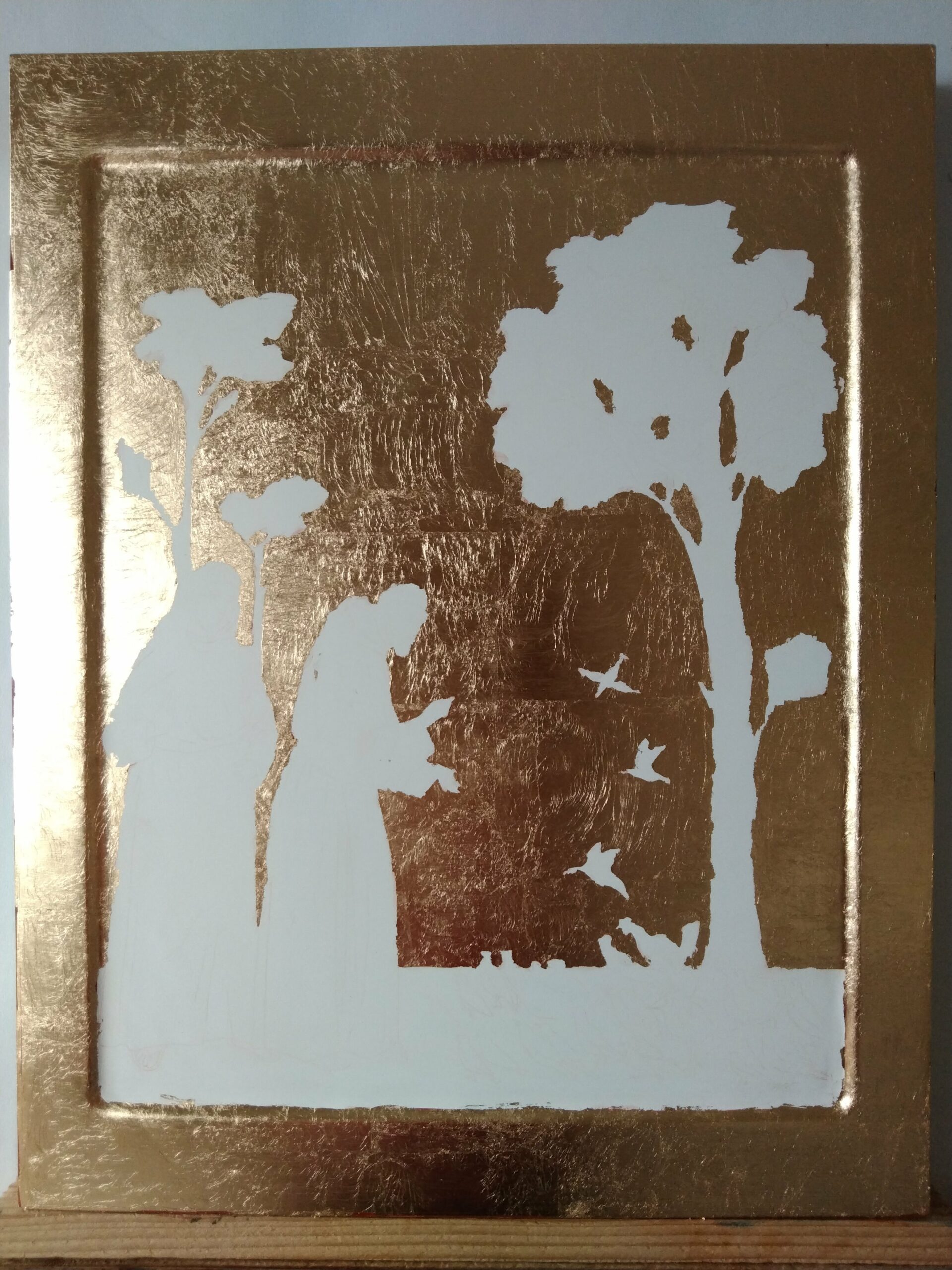 Je me suis donc inspirée de deux œuvres de Giotto : la fresque sur fond de ciel bleu de la basilique Saint François à Assise, et une peinture à la tempéra sur fond dorée qui se trouve au musée du Louvre :